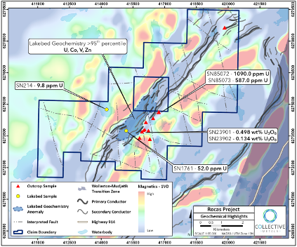 Geophysical map of the Rocas Project highlighting EM conductors, faults, historical uranium showings, and anomalous lakebed geochemistry